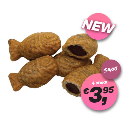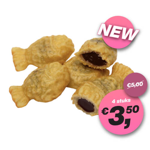 (4 st.) Gebakken Japanse wafels in de vorm van een vis, gevuld met warme gesmolten chocolade