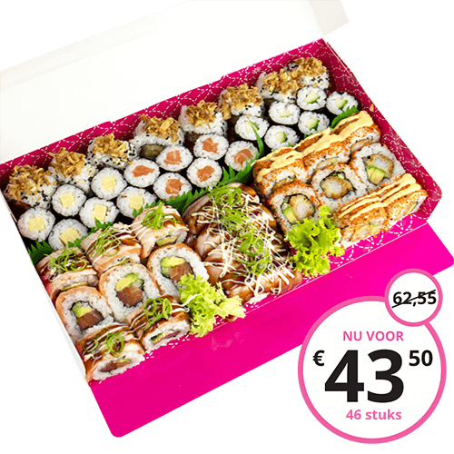 (46 st.) 8 Double Salmon Roll · 8 Crunchy Roll · 8 Spicy Ebi Roll · 6 Kappa Maki · 6 Salmon Maki · 6 Tamago Maki · 4 Seared Salmon Nigiri