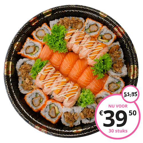 (36 st.) 8 Tempura ebi roll · 4 Crunchy roll · 4 Crispy chicken roll · 4 Crispy ebi roll · 4 California Salmon roll · 6 Salmon maki · 6 Tamago maki